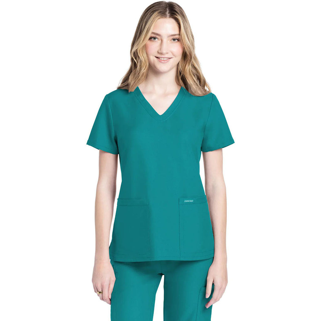 Cherokee Women's Teal Blue 2-Pocket V-Neck Top with a corporate logo is a must-have for those in multiple professions. Perfect for those in the medical field, those who work with animals, or those who provide in-home care, this comfortable option has side vents, antimicrobial and moisture-wicking technology, and roomy patch pockets.Highlights