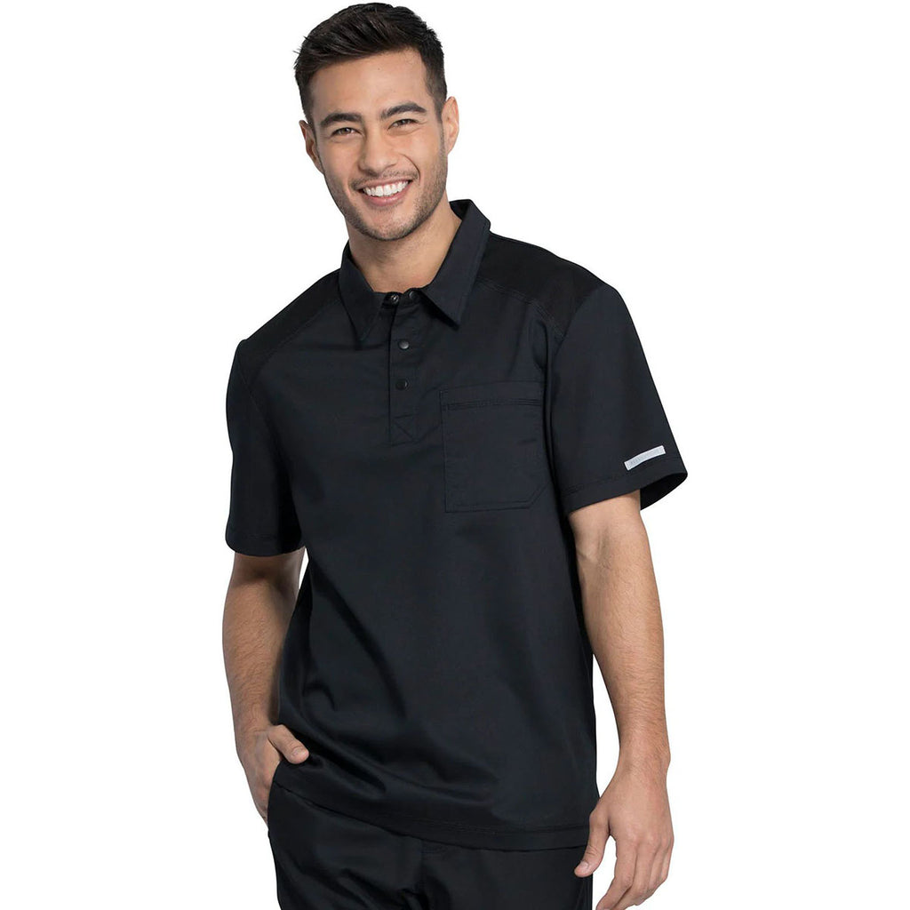 Enjoy an updated classic with a corporate Cherokee Men's Black Polo Shirt. This sleek, modern, sporty collared polo features a breathable mesh at the shoulders for added comfort and mobility. A single chest pocket adds convenience whether wearing this with scrub bottoms, on the golf course, or chilling with friends.Corresponding Women's Style: Cherokee Women's Black Tuckable Snap Front Polo Shirt