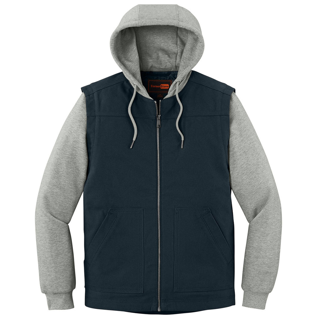 Corporate workwear is elevated with the CornerStone Men's Navy/Heather Grey Duck Fleece Full-Zip Hooded Jacket. Built tough with a rugged exterior and warm fleece lining, it's designed for job sites and outdoor wear. Add your custom logo to make it a dependable piece of branded apparel that keeps your team protected while representing your company.Highlights