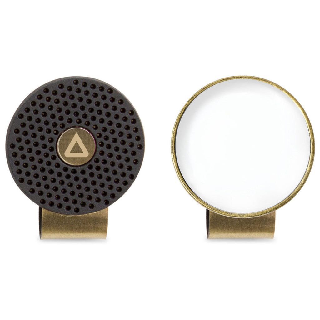 Design a corporate logo for the Ahead Black/Antique Brass Switchfix Hat Clip and enjoy a unique ball marker that is always within reach. The golf hat clip has a strong recessed magnet on the front for your ball marker and a silicone rubber surface to complement the divot tool. Perfect for golf tournaments, as gifts, or to sell in the pro shop.