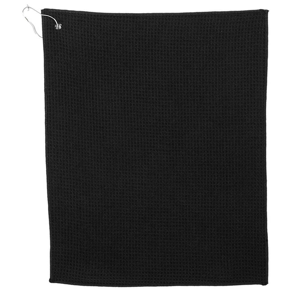 Add your corporate design to the Leed's Black 15" x 18" RPET 200g Microfiber Waffle Towel to sell at your pro shop or gift to the golfers in your life. The convenient waffle towel is sized for on-course cleaning and drying, while the metal grommet and hook can easily be attached to your golf bag for fast access.