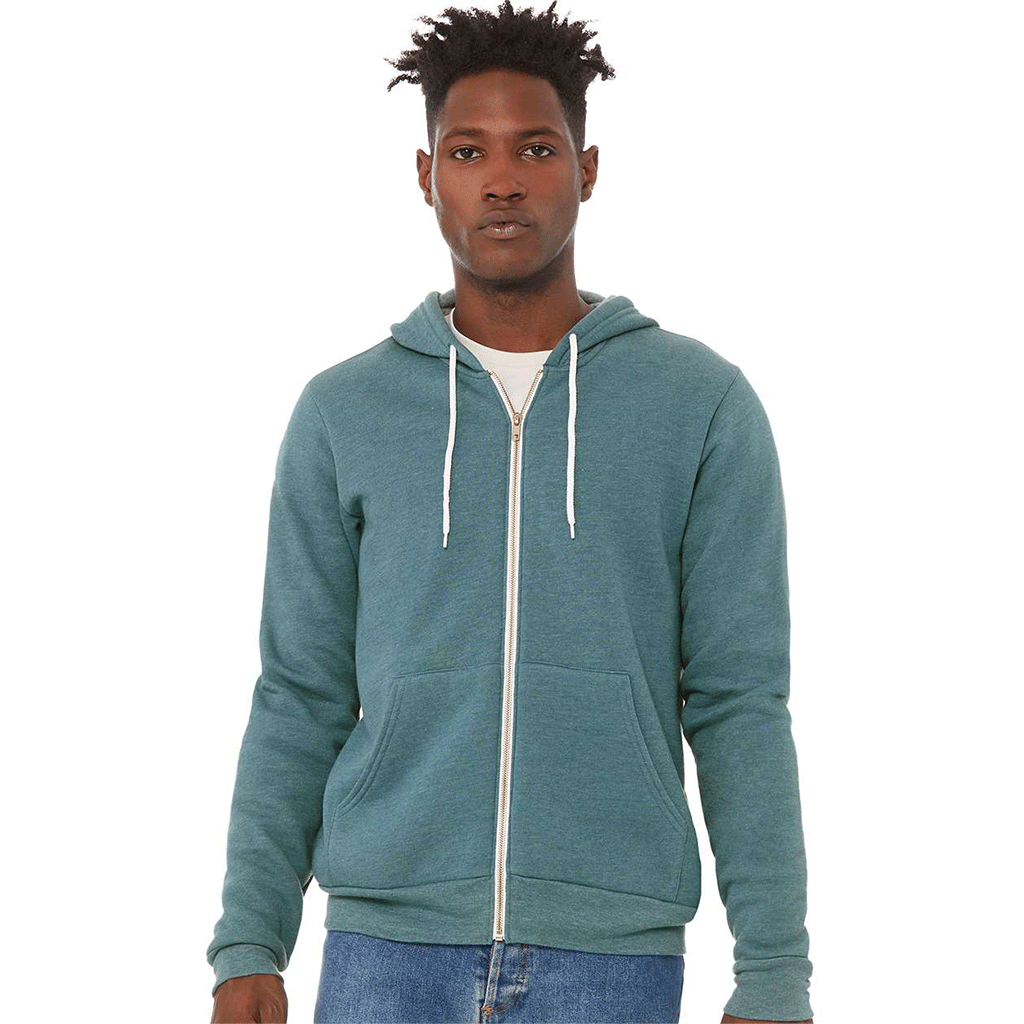 This is the Bella + Canvas Unisex Heather Deep Teal Full-Zip Hoodie. Each fabric brings something to the fashion table, as cotton creates a comfortable fit and polyester resists rips and tears. Other versions of the hoodie contain different percentages of cotton and polyester. Enjoy the cooling effect on your skin during humid summer days. Moisture wicking technology eliminates any perspiration that builds on your skin. Kangaroo pockets provide plenty of room to store all of your valuables. Unisex sizing makes the hoodie a great gift for office holiday grab bags. Do not forget to add your company logo to promote your brand in the community.