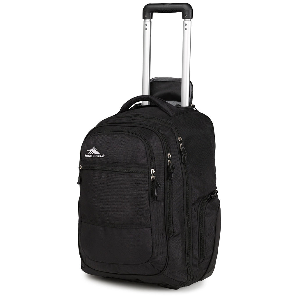 Give on-the-move individuals and tech junkies in your circle a secure and easy way to transport their essentials all while putting your company's logo in their hands with this customizable High Sierra Black Rev Wheeled Backpack. Features include a multi-compartment design; book-style zippered opening; fully-padded padded computer sleeve sized up to fit 15" laptops; corner-mounted wheels and hideaway telescoping handle.Highlights