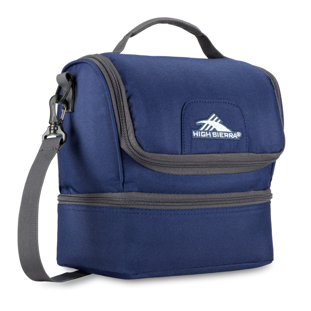 High Sierra True Navy Double Decker Lunch Bag - a reusable lunch bag made of a material that comes as a result of a reaction between the alcohol and organic acid. In comparison to food totes, it provides the extra value of being seen frequently to keep your company logo in front of the consumers. Designed with a drop bottom compartment and see-through divider for stacking sections to organize different foods. Fully padded insulated PEVA lining keeps contents fresh.Highlights