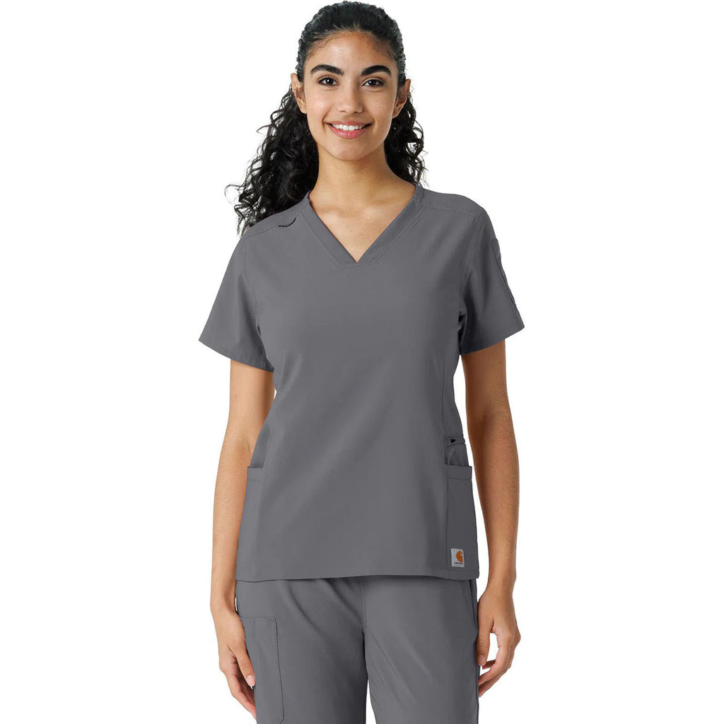 Keep it simple with a corporate logoed Carhartt Women's Pewter Knit Panel Scrub Top. This modern-fitting scrub top has a flattering and functional design with a V-neck, badge loop, and several convenient pockets. Perfect for medical offices of all types or to wear as you clean, relax, or unwind.