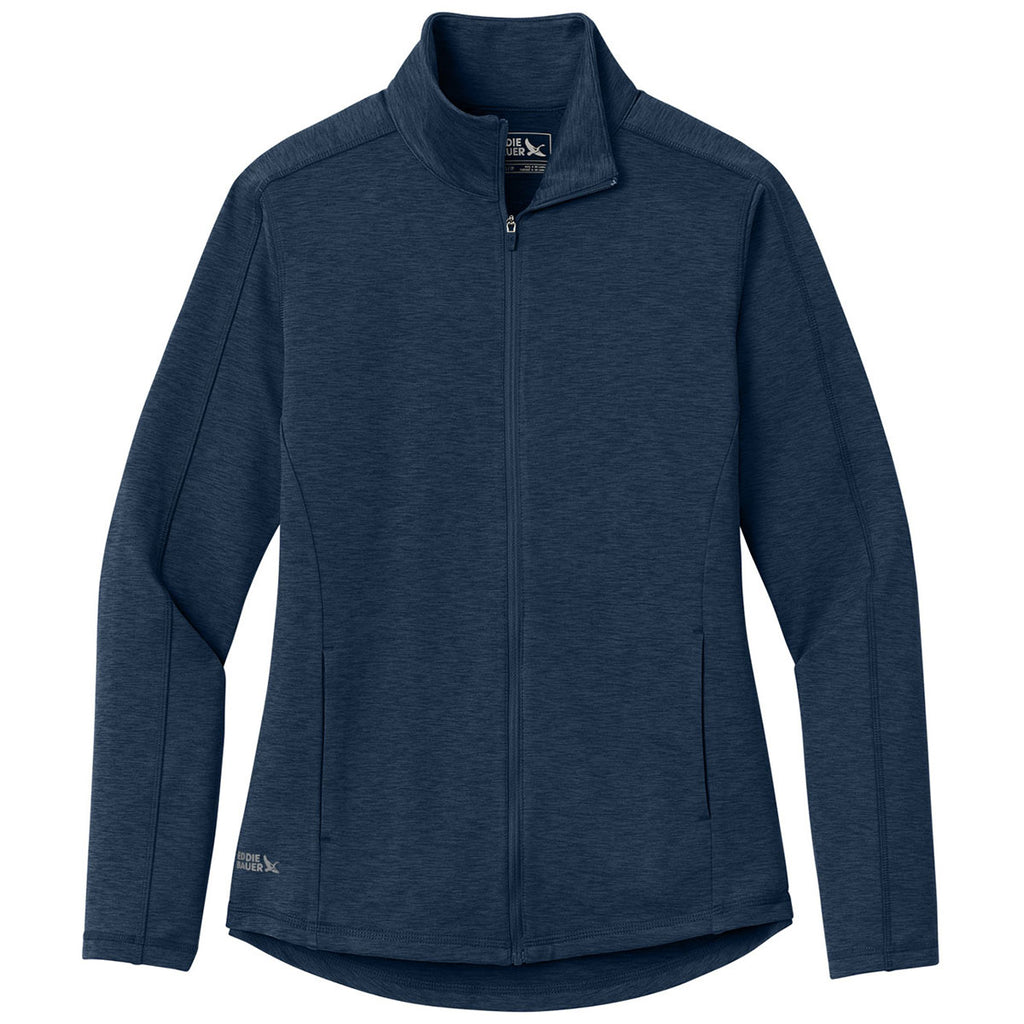 The Eddie Bauer Women's River Blue Navy Heather Adventurer Full Zip provides a flattering fit with practical custom appeal for corporate teams or group events. Featuring durable, lightweight fabric, it keeps wearers comfortable through all-day activities. This full zip layer effortlessly showcases embroidered logos beautifully, making it a reliable choice for active adventures and company representation.