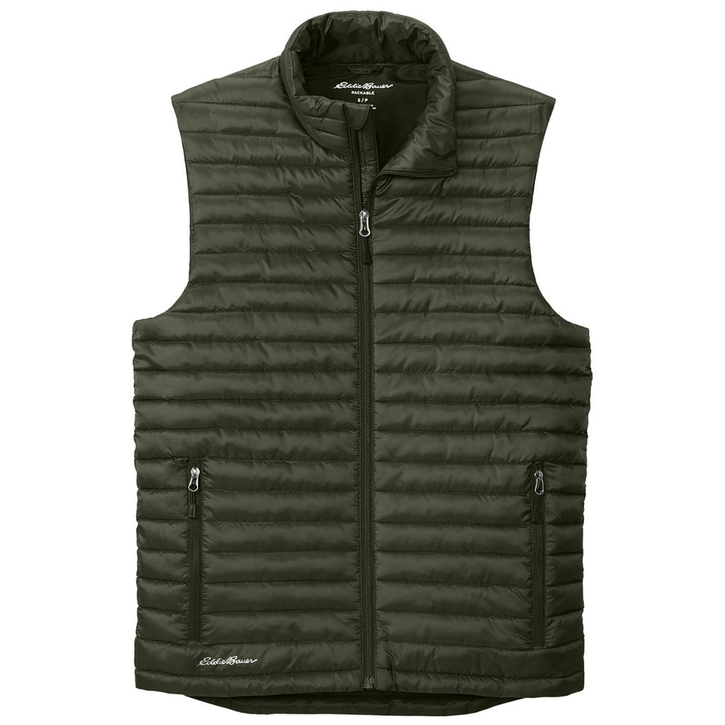 Eddie Bauer Men's Olive Green Packable Quilted Vest with a custom design is a fun and functional way to stay toasty while enjoying the Great Outdoors. This packable vest can be worn and then easily packed away when it is no longer needed for the day. Perfect for hiking, camping, and hunting. Place an order right away.