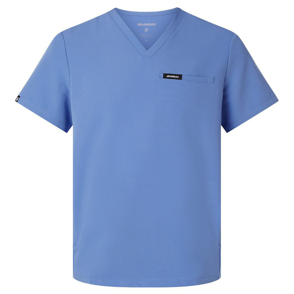 Jaanuu Men's Ceil Blue Platt 3-Pocket Scrub V-Neck Top with a custom logo creates an easy to wear option for all your scrub top needs. Made of a revolutionary four-way stretch fabric with a classic fit, this top is antimicrobial, wrinkle and fade resistant, and has moisture management properties so you will look and feel great while healing the sick or going about your day.Highlights