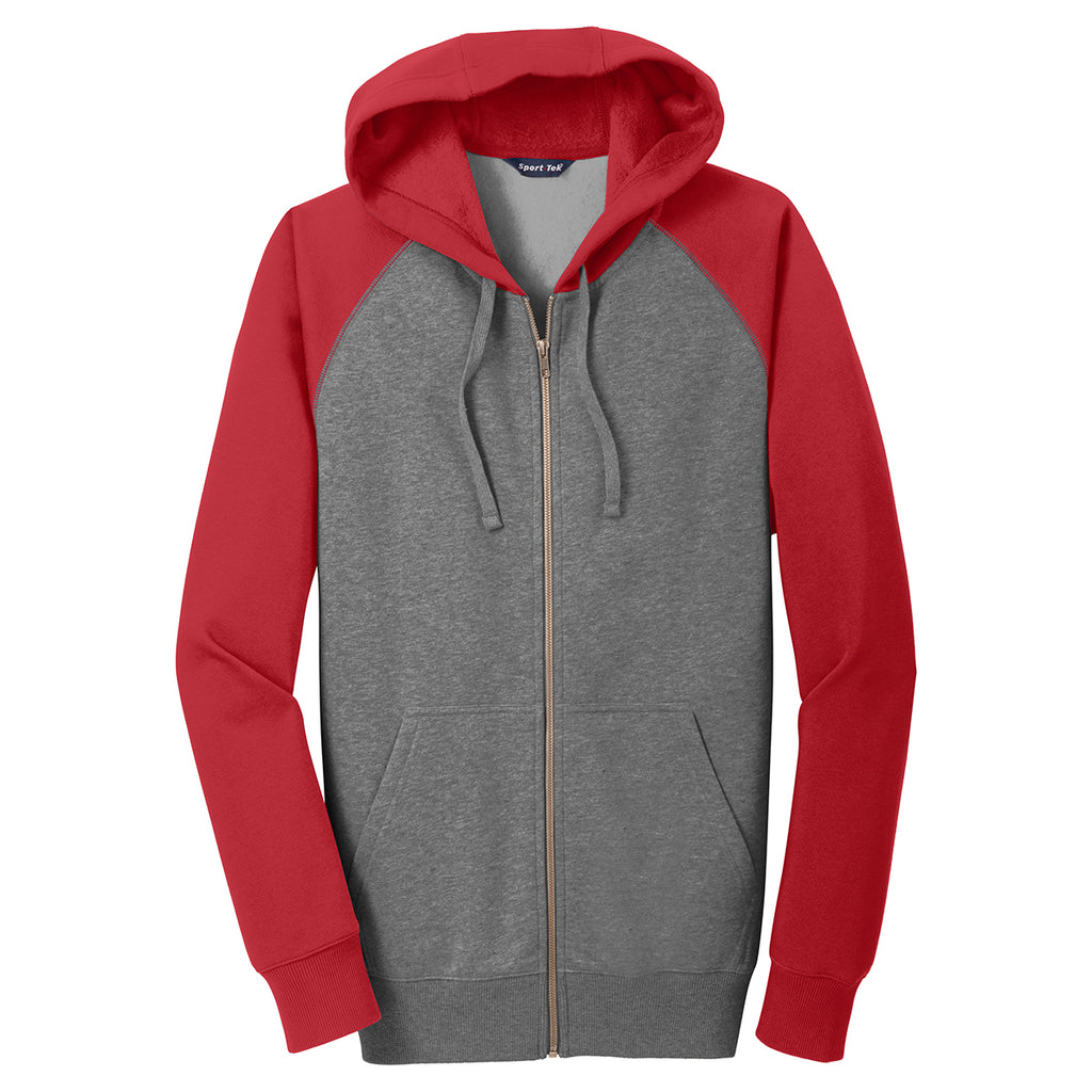 Sport-Tek Men's Vintage Heather/True Red Raglan Colorblock Full-Zip Hooded Fleece Jacket